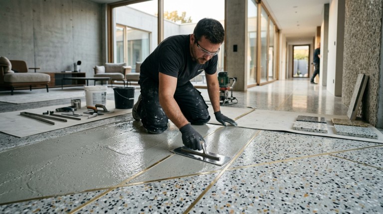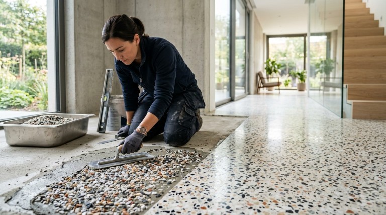 béton ciré, terrazzo/granito, enduits à la chaux, moquette de pierre, parquet, traitements techniques et rénovations. Chaque projet est réalisé avec une exigence absolue de qualité, de durabilité et d’esthétique.